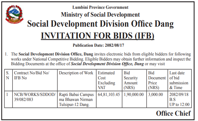 | 226 | Social Development Division Office Nepalgunj,Banke | Construction of Incomplete Building of Shree Sarswoti Ma.Vi. Kohalpur-08 Pipari,Banke | 03/12/2025 | PPMO | 18/12/2025 | Click Here | |