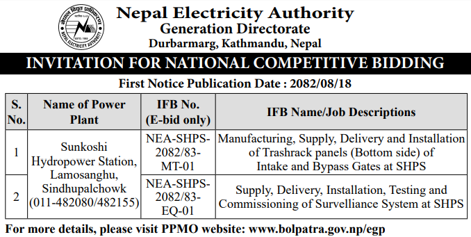 | 285 | Water Supply and Sanitation Division-3, Sindhupalchok | Supply and Delivery of HDPE Pipe for Diffrent Water Supply Project of Sindupalchowk District | 03/12/2025 | PPMO | 18/12/2025 | Click Here | |