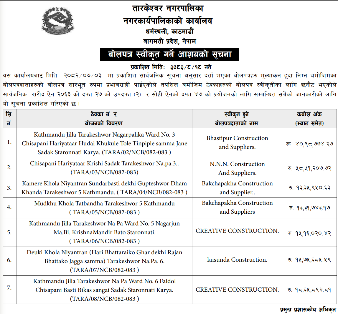 | 7 | Mandandeupur Municipality | Kavrepalanchok Jilla Mandandeupur Nagarpalika Ward No 1 Kamchething Tol Tamang Basti Antargat Purwadhar Starunnati karya | 03/12/2025 | PPMO | 04/01/2026 | Click Here | |