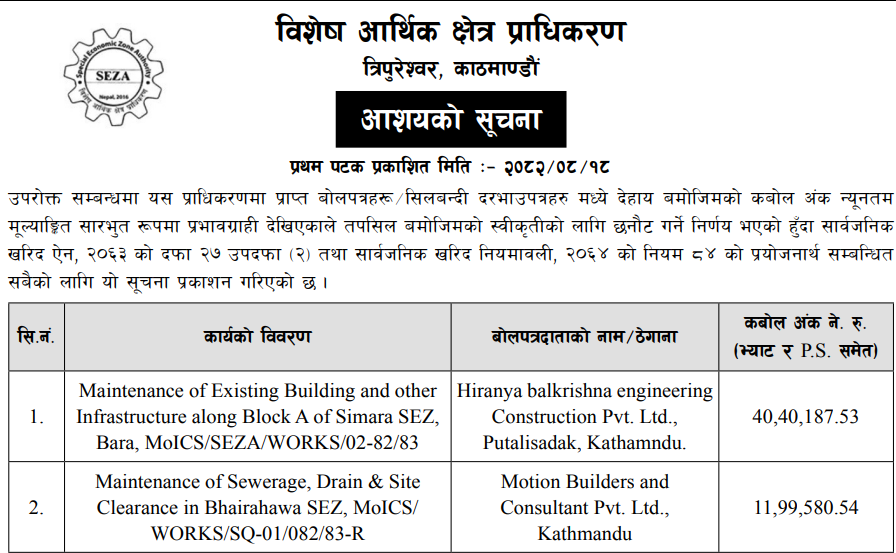 प्रदेश ७ मा प्रकाशित निर्माण सम्बन्धी बोलपत्र तथा आशयका सुचनाहरु