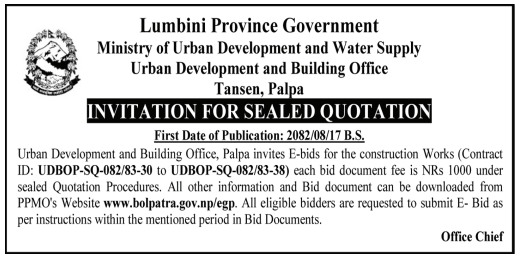 | 246 | Urban Development and Building Office, Palpa | Urban Infrastructure Development Work at Chisapani-Rithako Rukh(Chandrakot-06), Bausidi-Dakuwaram(Chandrakot-07) | 03/12/2025 | PPMO | 18/12/2025 | Click Here | |