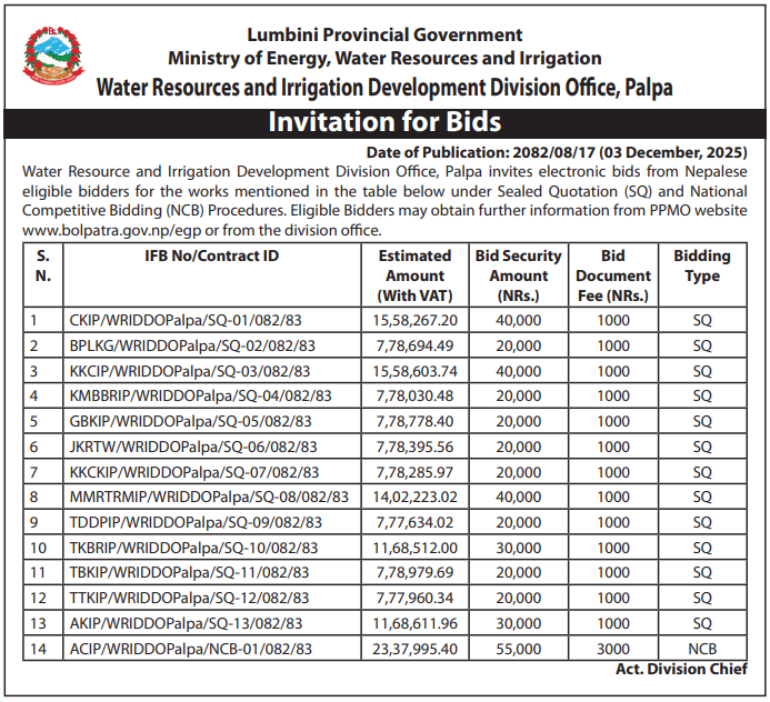 | 212 | Water resource and Irrigation Development Division, Palpa | Mathar Kulo, Mathillo Rajhara, Tallo Rajghara, and Masbui Kulo IP, Rampur 3 | 03/12/2025 | PPMO | 18/12/2025 | Click Here | |