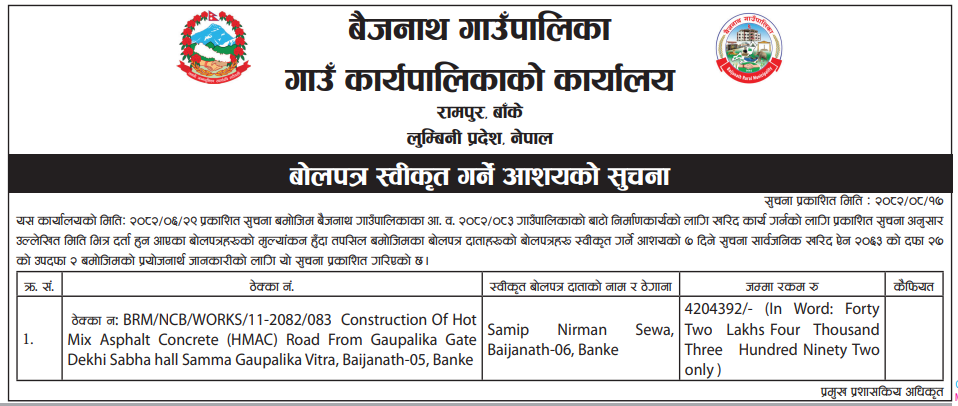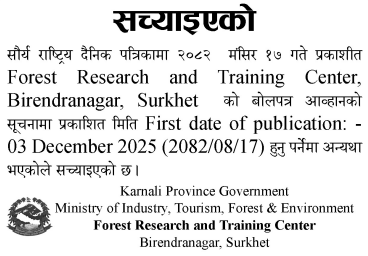 | 227 | Birendranagar Municipality, Surkhet | Construction of Datraya Mandir Yogahall Construction, Birendranagar-7,Surkhet | 03/12/2025 | PPMO | 18/12/2025 | Click Here | |