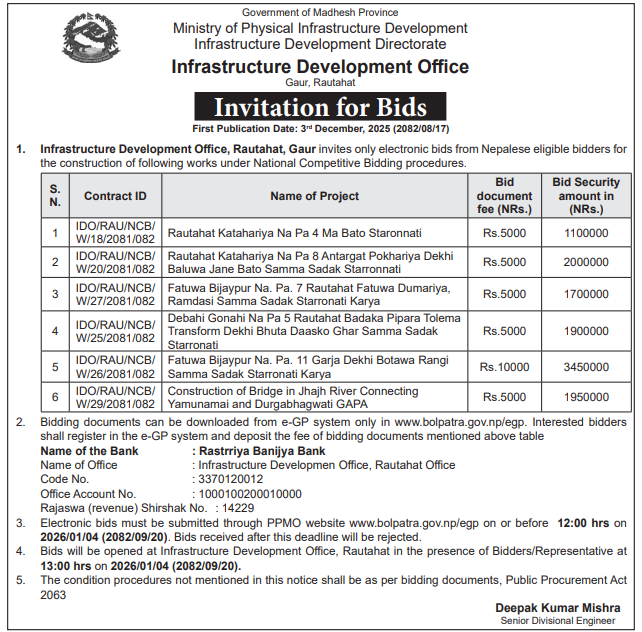| 22 | Infrastructure Development Office , Rautahat | CONSTRUCTION OF BRIDGE IN JHAJH RIVER CONNECTING YAMUNAMAI AND DURGABHAGWATI GAPA | 03/12/2025 | PPMO | 04/01/2026 | Click Here | |