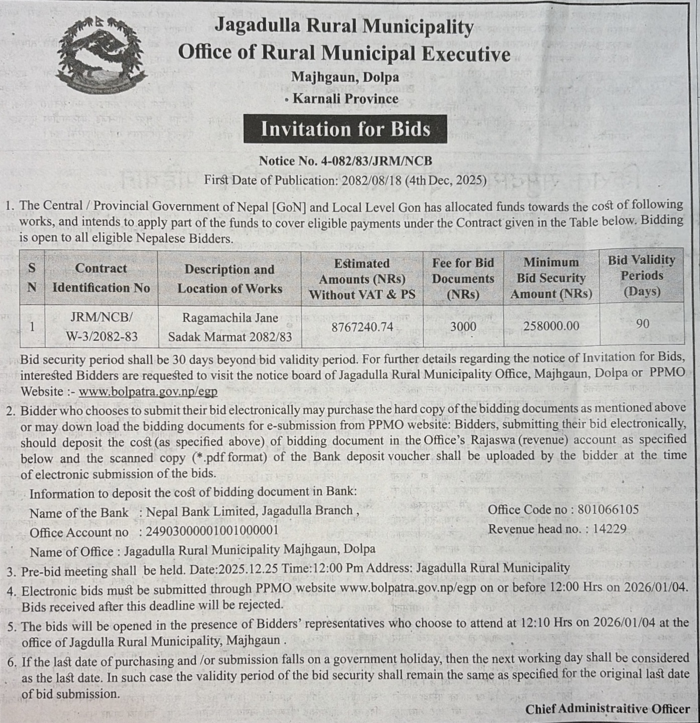 | 251 | Nalgad Municipality, Jajarkot | Supply and Delivery of Sanitary Pad in Nalgad Municipality | 03/12/2025 | PPMO | 04/01/2026 | Click Here | |