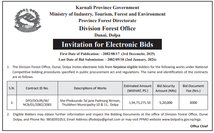| 35 | Division Forest Office, Dolpa | She-Phoksundo Tal jane Padmarg Nirman, Thulibheri Municipality-10 & 11, Dolpa | 03/12/2025 | PPMO | 02/01/2026 | Click Here | |