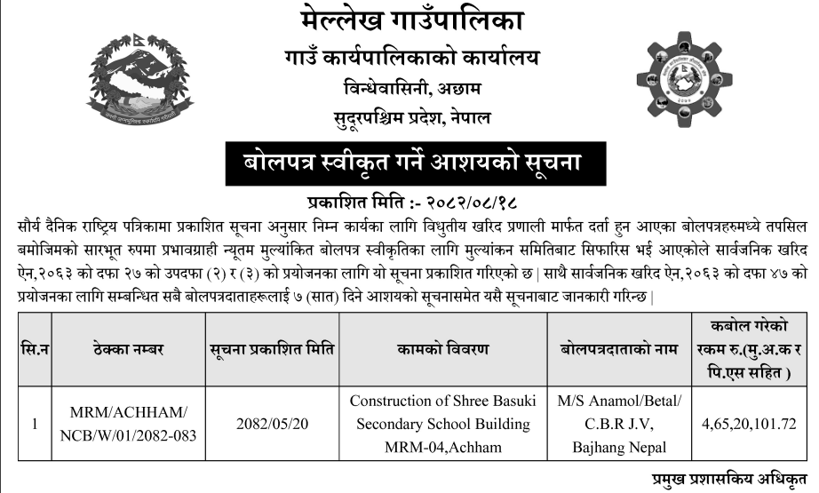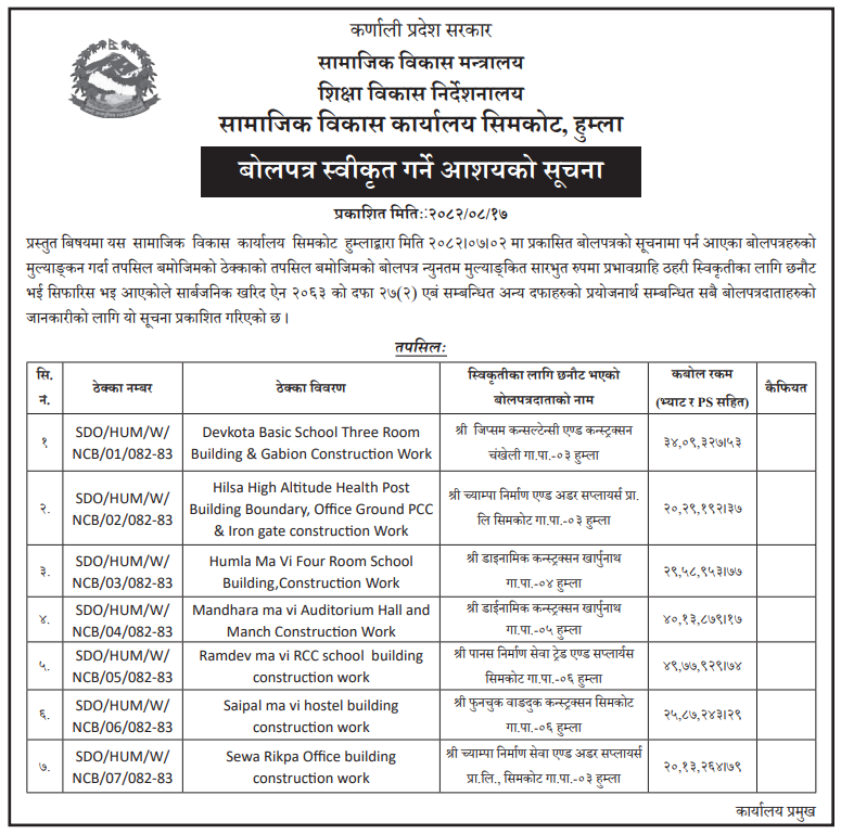 | 23 | Social Development Office, Darchula | Construction of School Building in Latinath Secondary School Raskot Marma Ga pa -03 Darchula | 03/12/2025 | PPMO | 04/01/2026 | Click Here | |