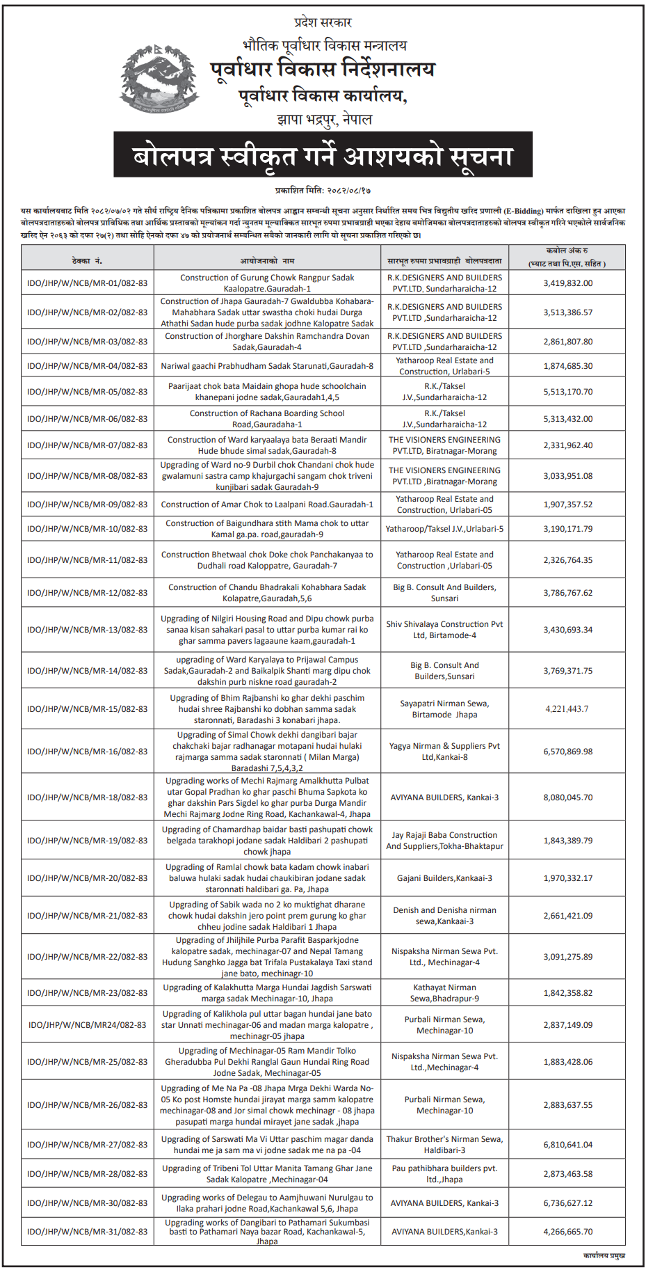 | 202 | Infrastructure Development Office , Jhapa | Kanchan Ganga Tol Road no-04 Yam Bimali ko ghar hundai Jane sadak starunnati ,Birtamode-04, Jhapa | 03/12/2025 | PPMO | 18/12/2025 | Click Here | |