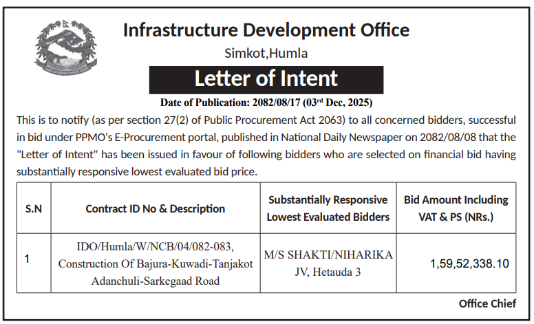 | 264 | Kharpunath Rural Municipality, Humla | Procurement And Supply of Non Local Materials for Aanyarukha Dadamajha Basti Landslide Control Project. | 03/12/2025 | PPMO | 02/01/2026 | Click Here | |