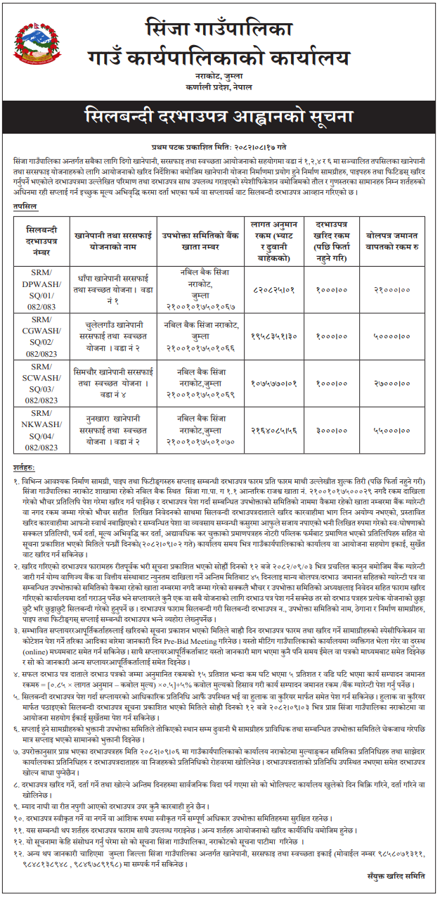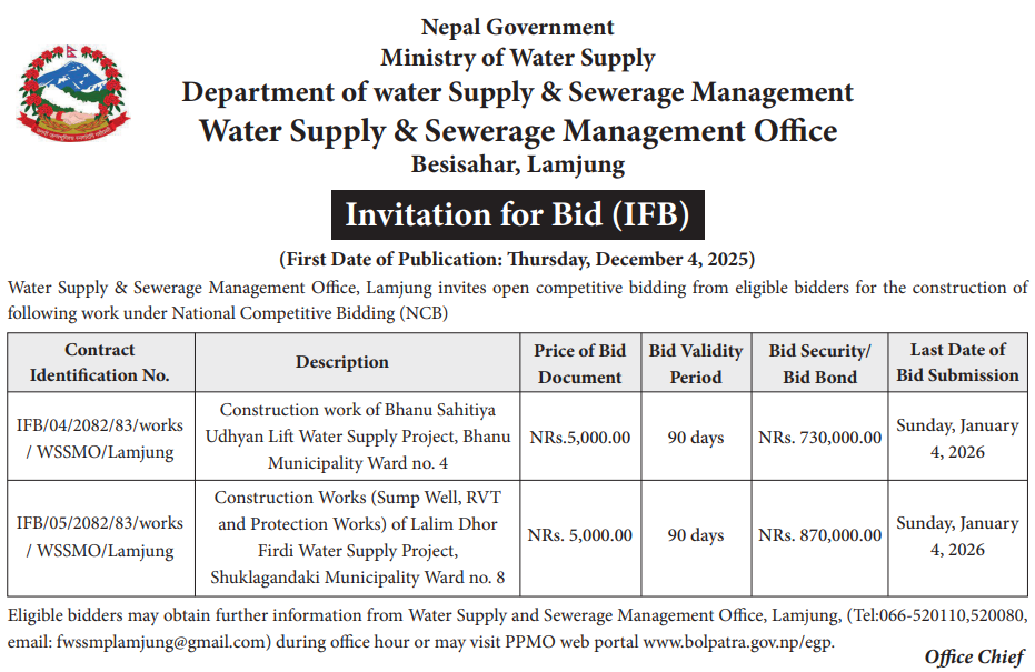 | 34 | Water Supply and Sanitation Division Office, Syangja, Gandaki Province | Construction & procurement of Birgha Simalbagar WSP, Scheme 2, Kaligandaki 4, Syangja | 03/12/2025 | PPMO | 02/01/2026 | Click Here | |