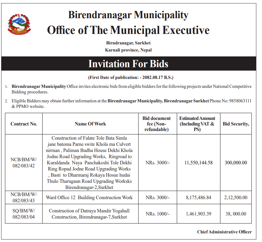 | 10 | Mandandeupur Municipality | WADA NO.6 KA SADAK YOJNAHARU PART-1 | 03/12/2025 | PPMO | 04/01/2026 | Click Here | |