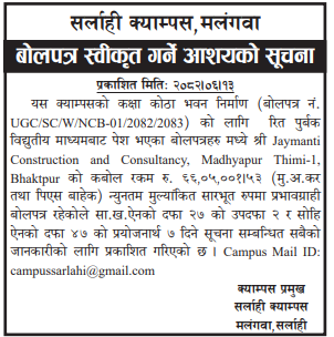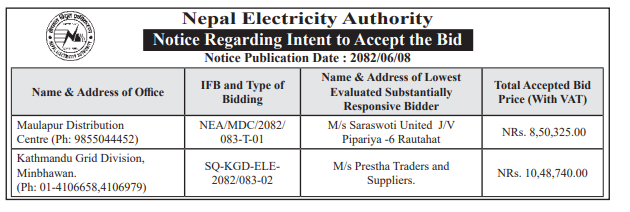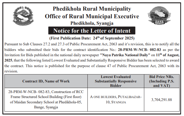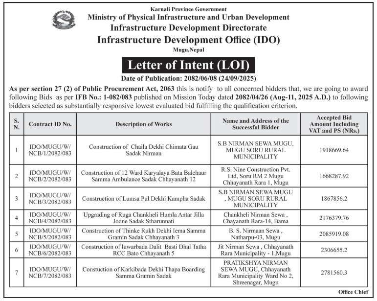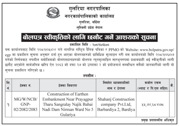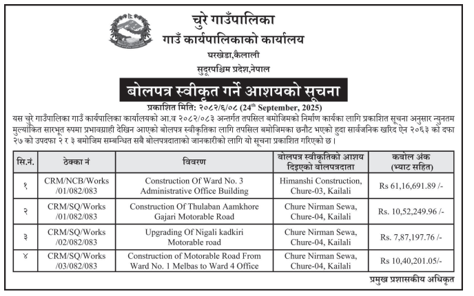 बोलपत्र स्विकृत ; Bid Award (Construction only) 06/10/2025 (Monday)