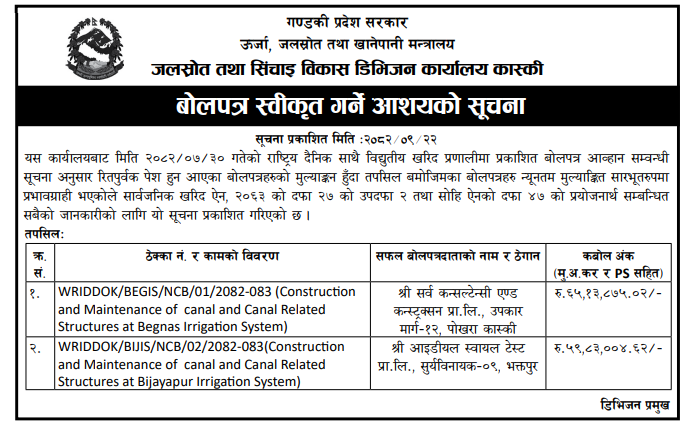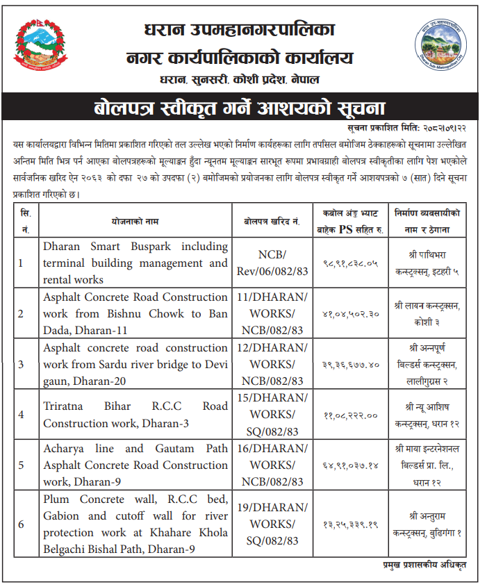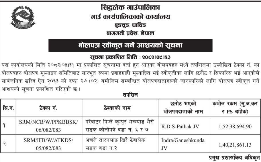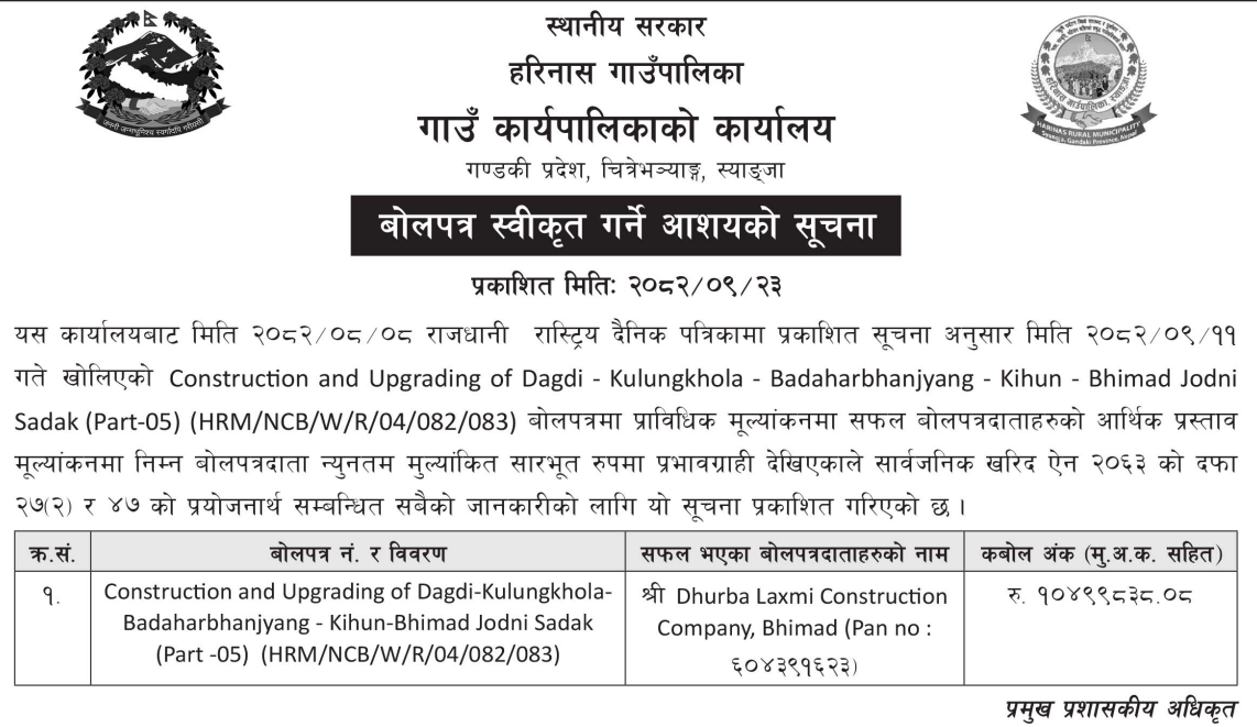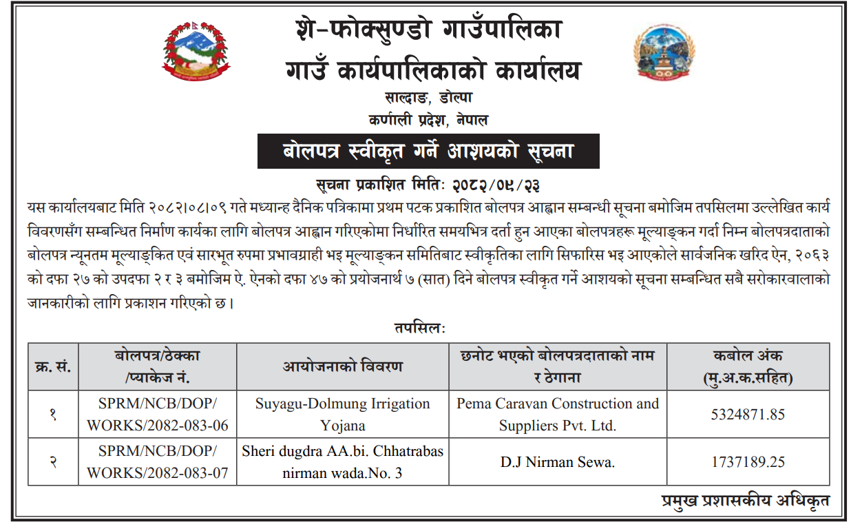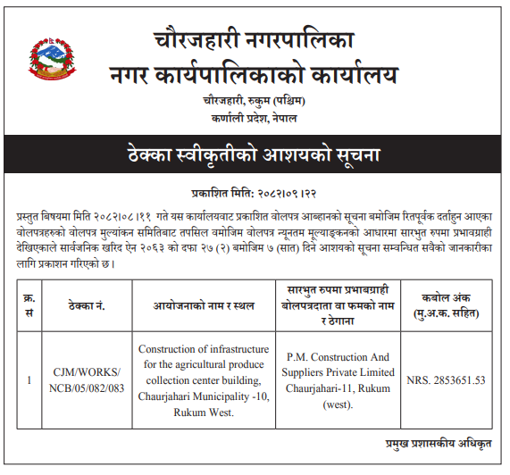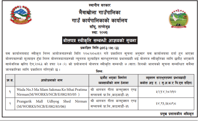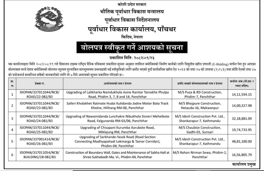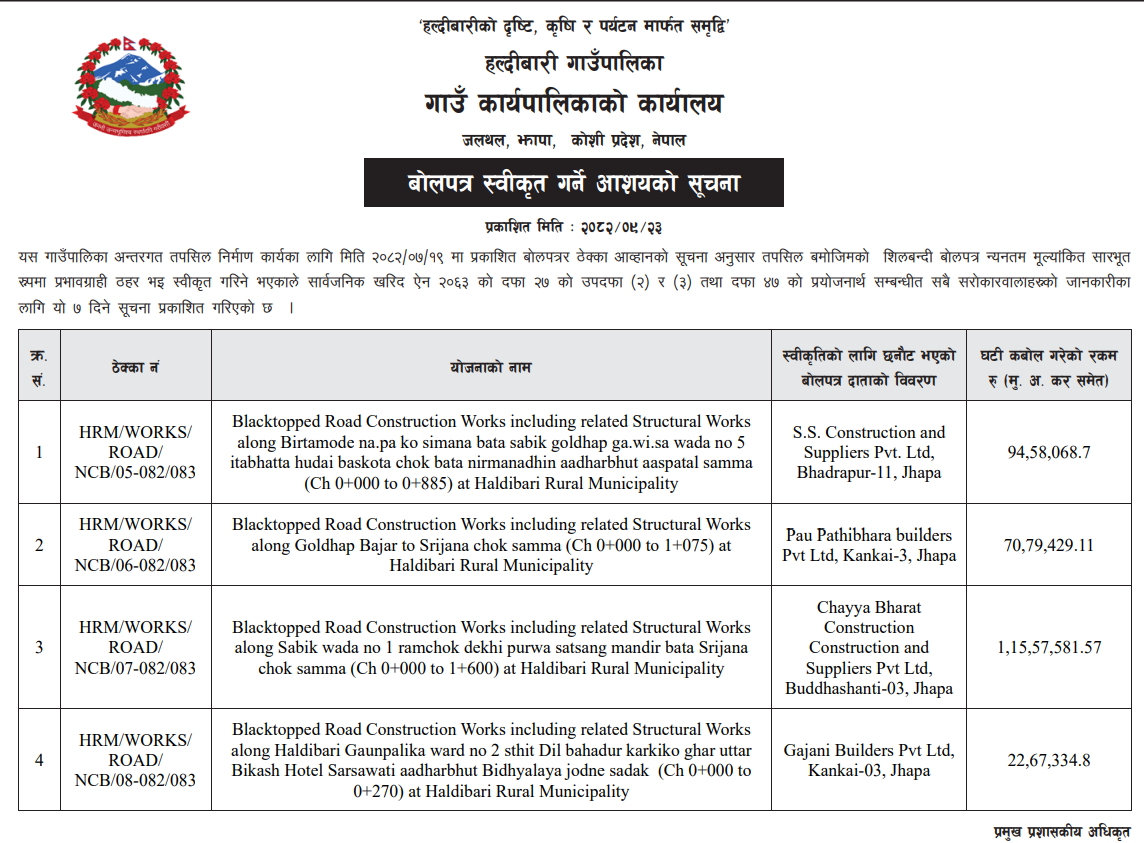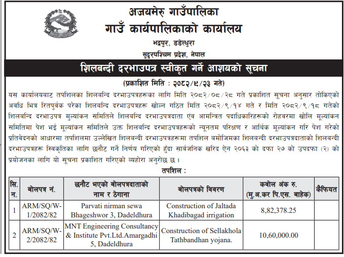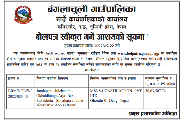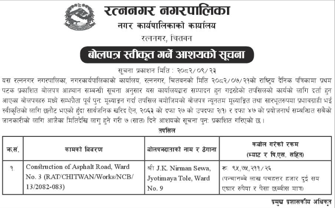 बोलपत्र स्विकृत ; Bid Award (Construction only) 07/01/2025 (Wednesday)
