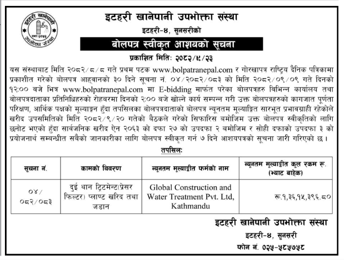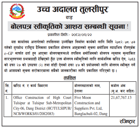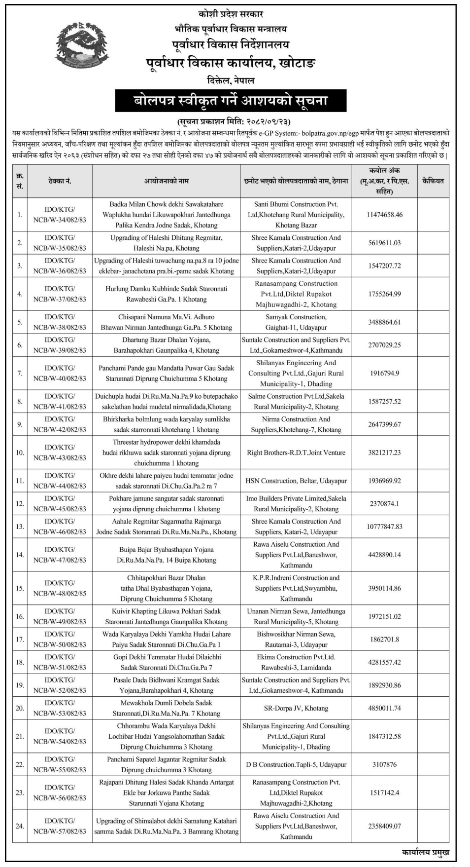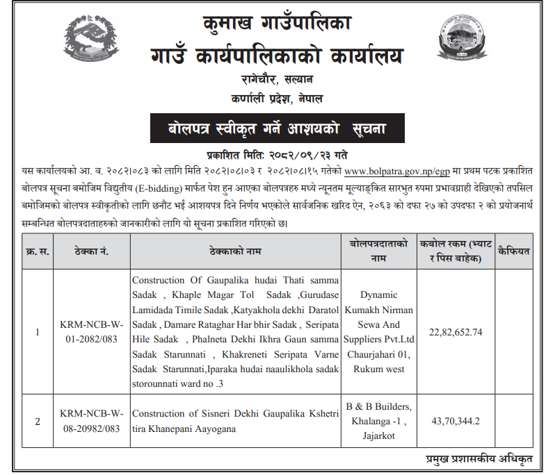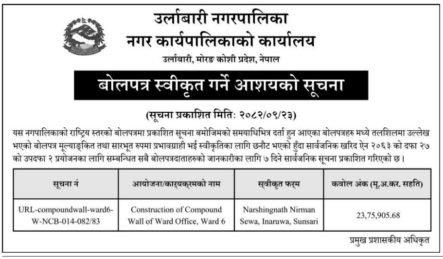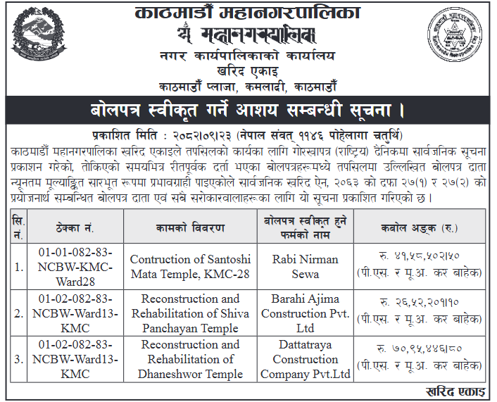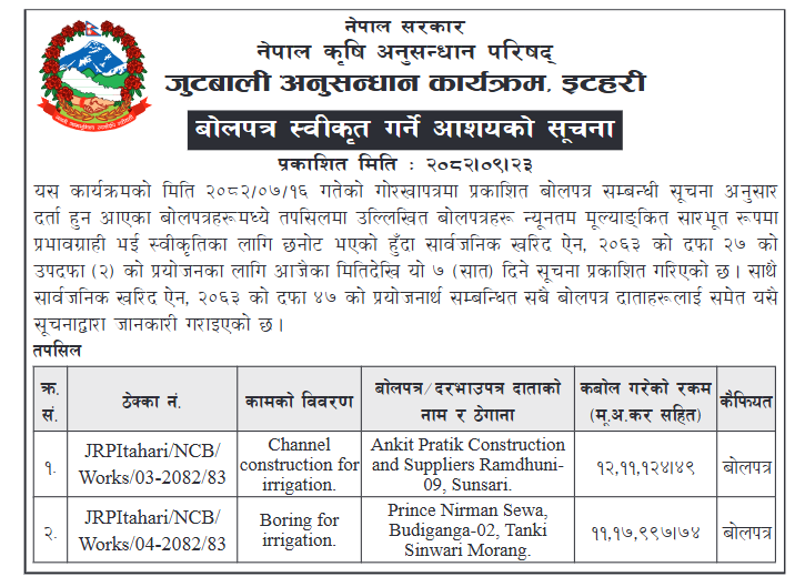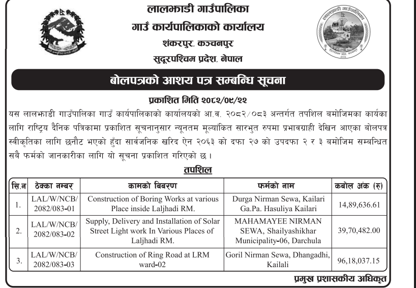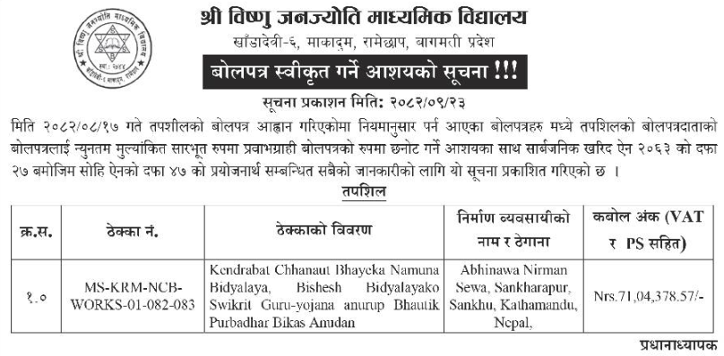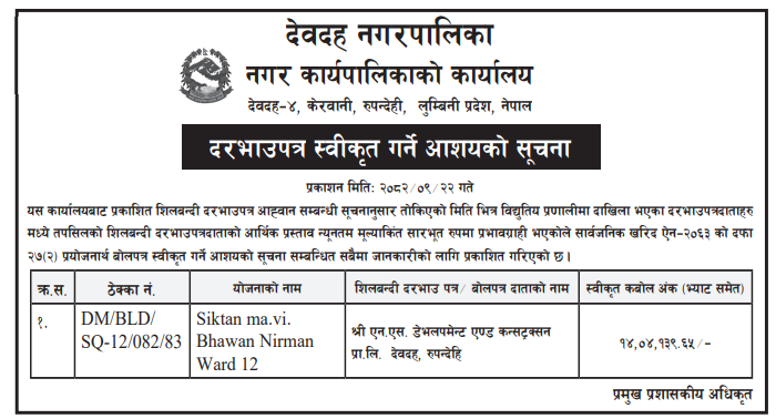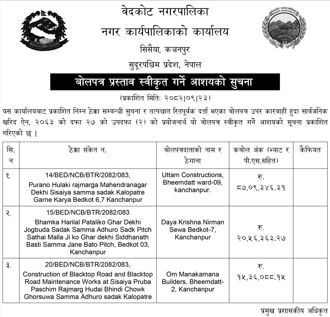 बोलपत्र स्विकृत ; Bid Award (Construction only) 07/01/2025 (Wednesday)