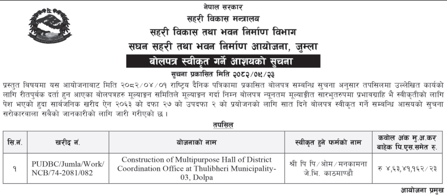 | 7 | Project Of Urban Development and Building Construction-Ramechhap,Manthali | Construction of Dolakha Sabha hall in Dolakha District (Including Retrofit and Second Phase) | 06/01/2026 | PPMO | 06/02/2026 | Click Here | |