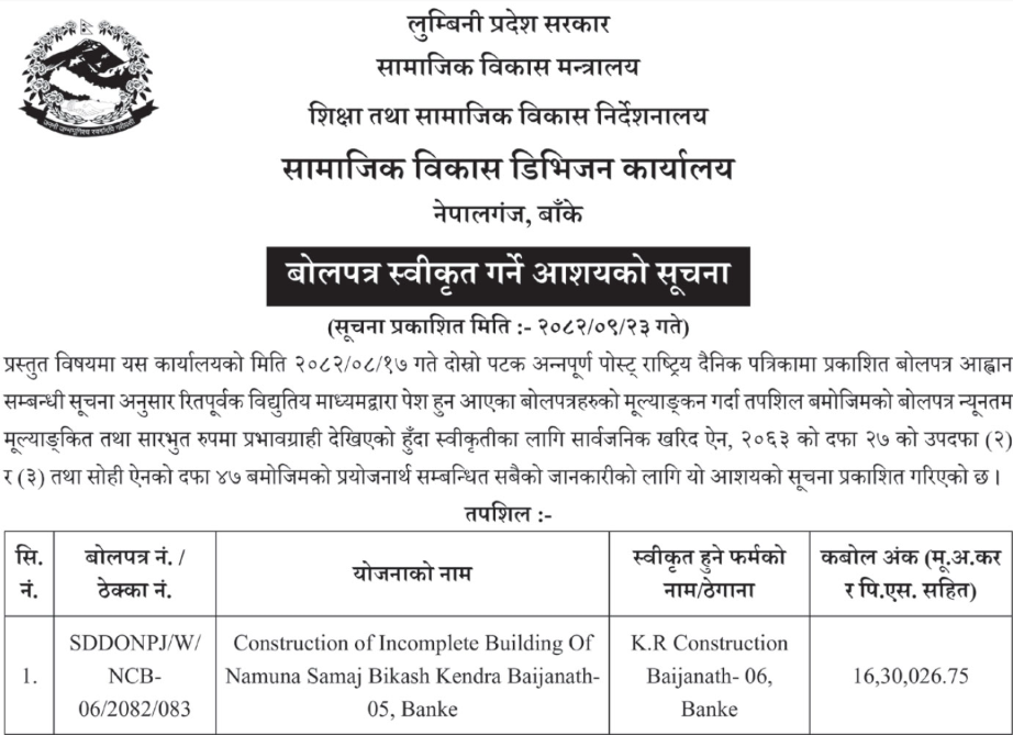 | 20 | Social Development Division office, pyuthan | Construction of Building: Devibhakta Aa.vi Sunilsmriti Ga.Pa -01 Rolpa. | 06/01/2026 | PPMO | 05/02/2026 | Click Here | |