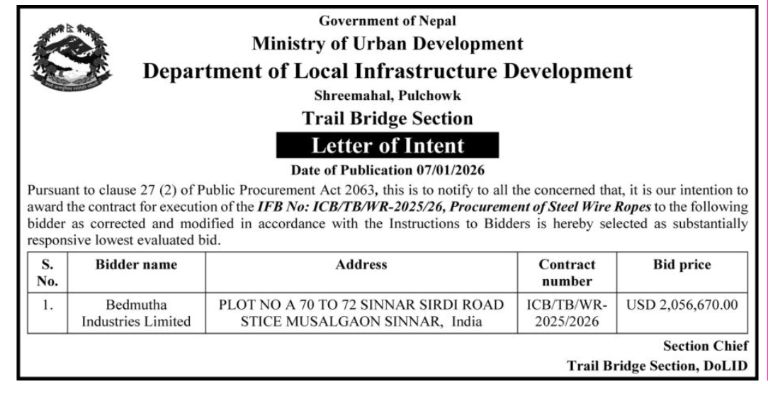 | 63 | Belkotgadhi Municipality, Baghkhor, Nuwakot | Construction of Baghkhor Sirantole Chimteshwor Foot Trail 09, Belkotgadhi -09, Nuwakot | 06/01/2026 | PPMO | 05/02/2026 | Click Here | |