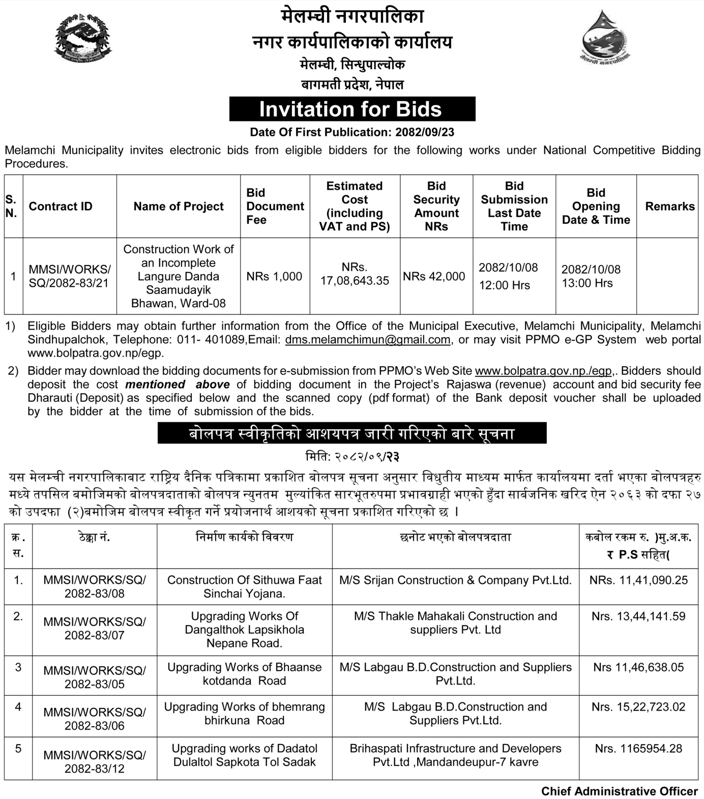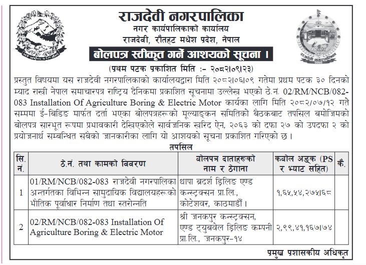 | 13 | Janakpurdham Sub-Metropolitan City | Additional Work of Shree Rastriya Madhyamik Vidhyalaya Rupaith Belhi, Janakpurdham-20 and Shree Sarsawati Namuna Ma.Bi. Janakpurdham 9 | 06/01/2026 | PPMO | 05/02/2026 | Click Here | |