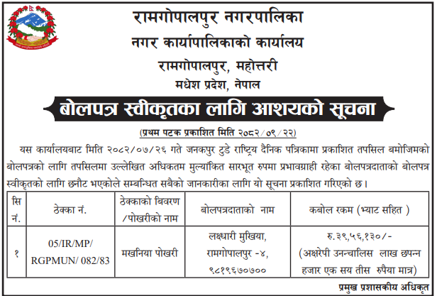 | 16 | Janakpurdham Sub-Metropolitan City | Beautification of Subbaji Pond at Ward No. 15, Janakpurdham | 06/01/2026 | PPMO | 05/02/2026 | Click Here | |