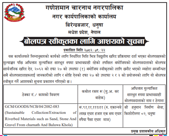 | 168 | Dangisharan Rural Municipality, Office of Rural Municipal Executive | EXTRACTION, COLLECTION AND SALES OF RIVERBED MATERIALS AT KUIRIGANAAR GHAAT. | 06/01/2026 | PPMO | 21/01/2026 | Click Here | |