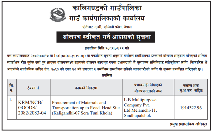 | 249 | Gandaki Rural Municipality | Procurement, Supply & Delivery of Sanitary Pads. | 06/01/2026 | PPMO | 21/01/2026 | Click Here | |
