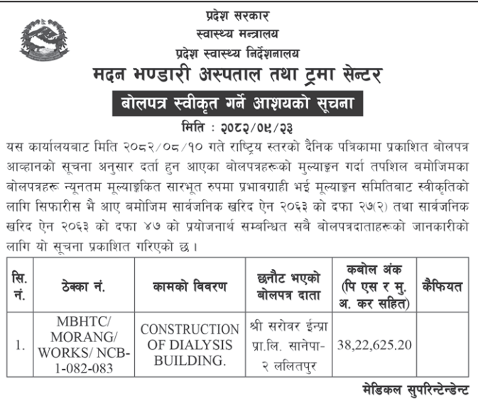 | 226 | Rapti Academy of Health Sciences, Dang | CONSTRUCTION OF DOCTOR'S MEETING HALL, COMPOUND FENCING AND PARTITION OF NUTRITION BLOCK | 06/01/2026 | PPMO | 20/01/2026 | Click Here | |