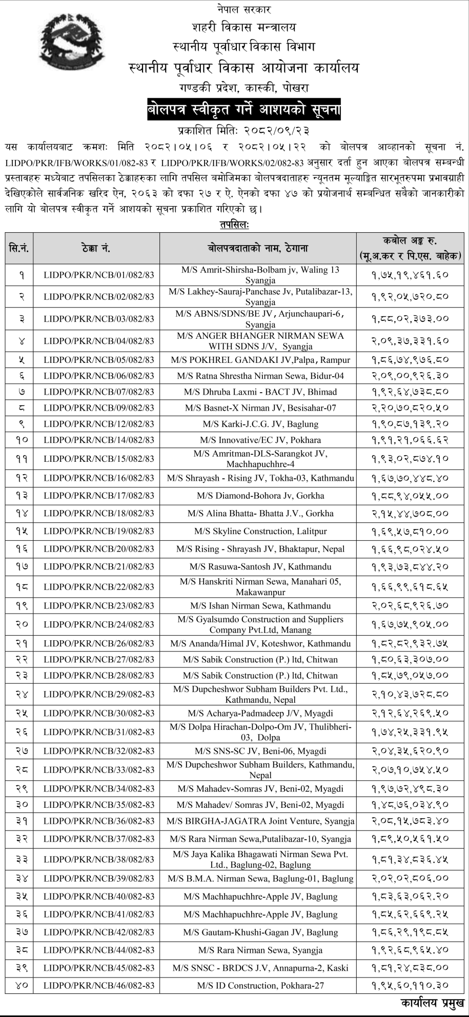 | 178 | Local Infrastructure Development Project Office, Pokhara | Construction/Upgrading of Hugdisir Nayabazar Shantipur Road, Bareng Rural Municipality-2, 3, Baglung | 06/01/2026 | PPMO | 21/01/2026 | Click Here | |