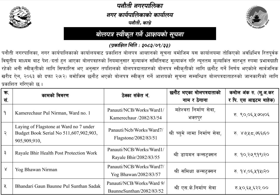 | 59 | Infrastructure Development Office Kavrepalanchok | Upgrading Works on Om Dada Sarada Devisthan Road, Panauti Municipality - 09 | 06/01/2026 | PPMO | 05/02/2026 | Click Here | |