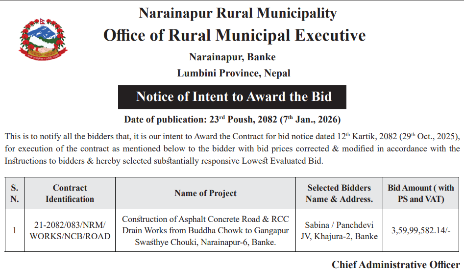 | 203 | Infrastructure Development Office, Banke | Asphalt Concrete work at Baijnath Gaupalika ra Khajura Gaupalika Gunapur Rampur Digiya gaun Syaulibazar hudai Cancer Hospital jodne Road, Baijnath-5, Banke | 06/01/2026 | PPMO | 21/01/2026 | Click Here | |