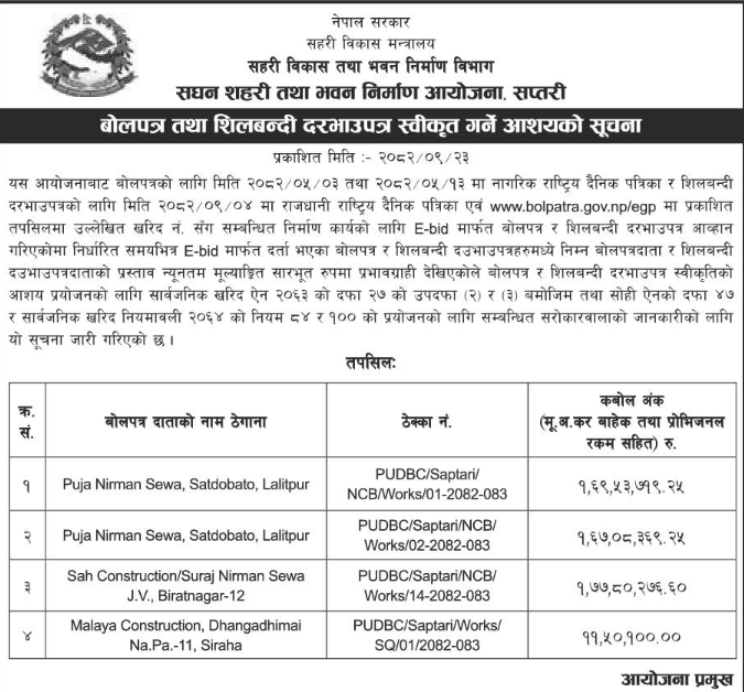 | 41 | Belaka Municipality Office, Rampur Udayapur | Construction of Shree Saptakaushika Secondary School Building, Ward No. 2 | 06/01/2026 | PPMO | 05/02/2026 | Click Here | |