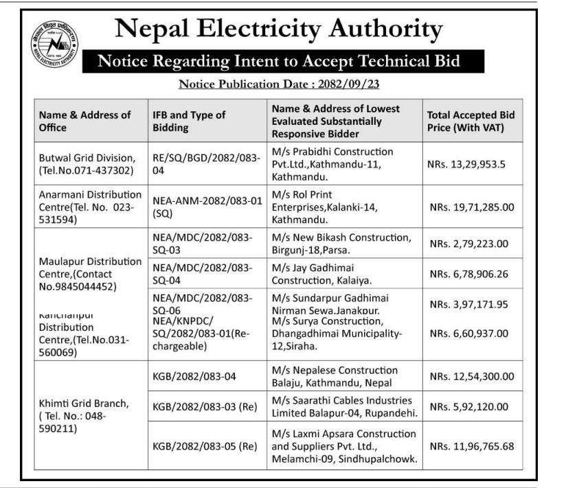 | 183 | NEA, Jorpati Distribution Center | HT/LT LINE UPGRADATION AND LTLINE EXTENSION WORK | 06/01/2026 | PPMO | 21/01/2026 | Click Here | |