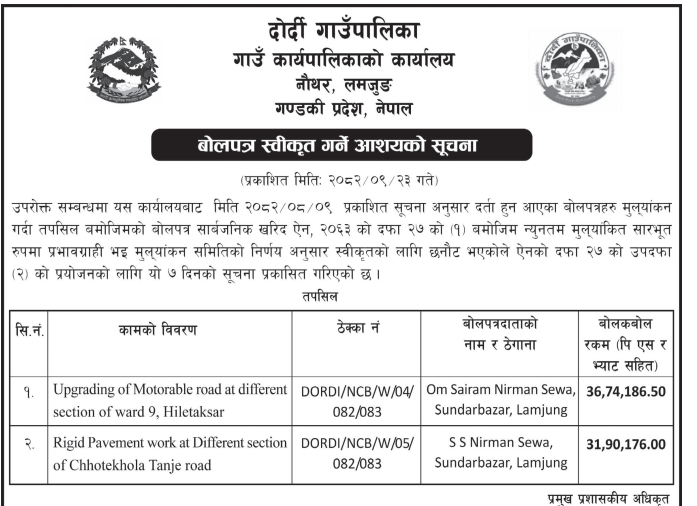 | 5 | Himali Rural Municipality, Bajura | Phaiti Village to Tithi Road Construction ,Bajura,Himali Rural Municipality-04 | 06/01/2026 | PPMO | 06/02/2026 | Click Here | |