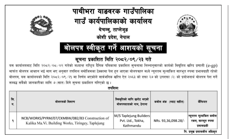 | 255 | Mikwakhola Rural Municipality, Taplejung | Construction works of Beshigaun Adharbhut Bidhyalaya Bhawan Nirman | 06/01/2026 | PPMO | 08/02/2026 | Click Here | |