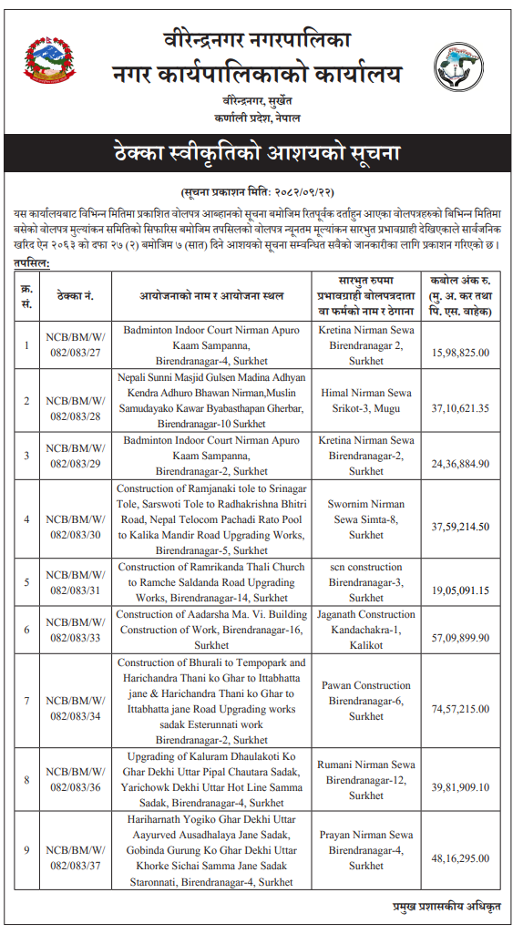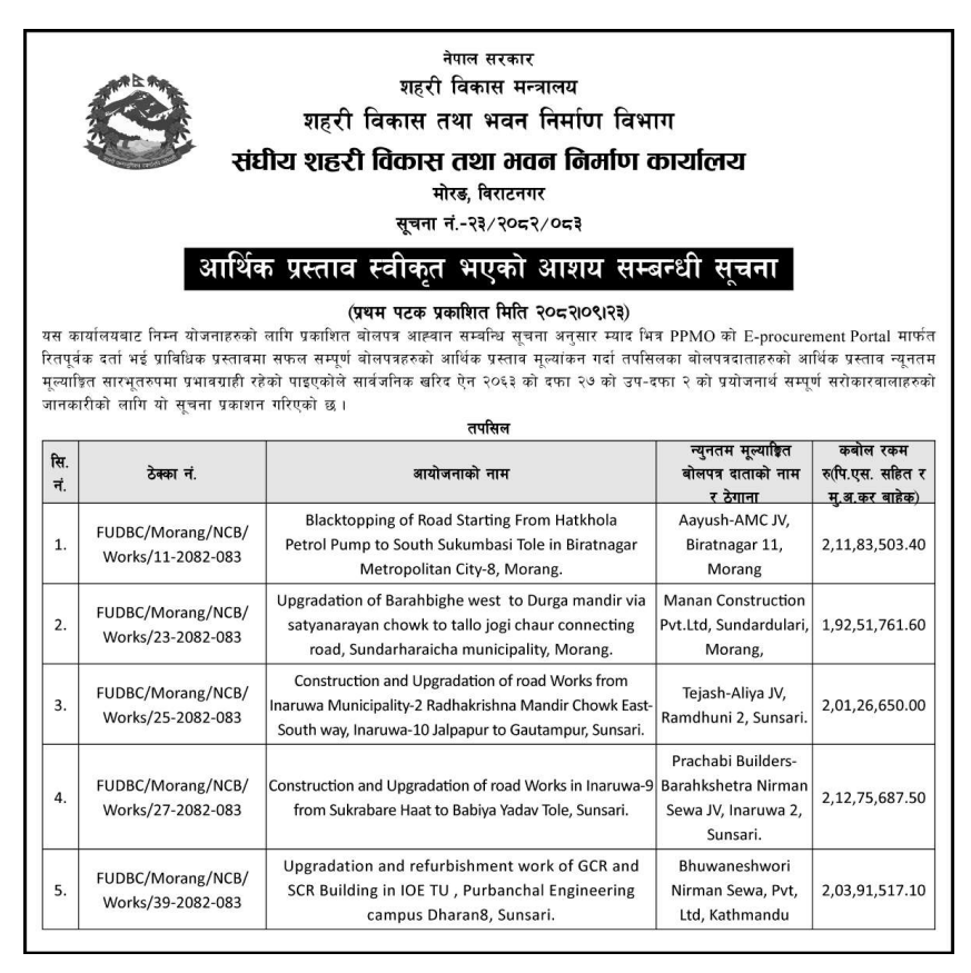 | 40 | Belaka Municipality Office, Rampur Udayapur | Construction and Upgrading of Setikhola Ring Road | 06/01/2026 | PPMO | 05/02/2026 | Click Here | |