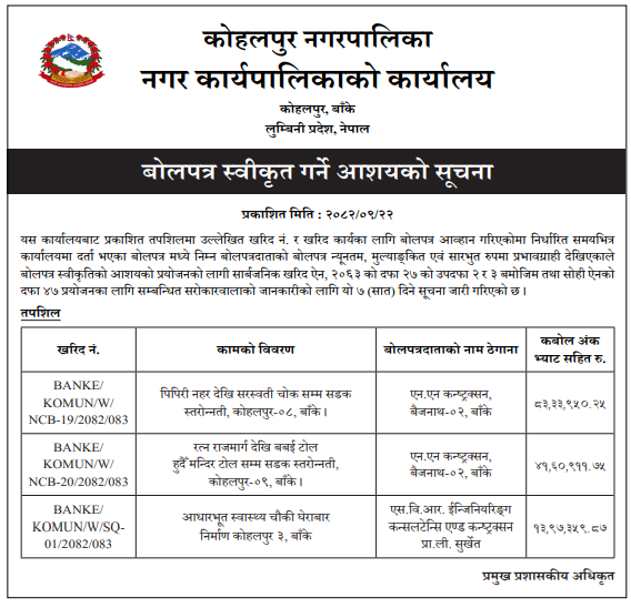 | 261 | Kohalpur Municipality Office,Banke | Jharkatti Duduwa Khola ma Jho. Pu. Nirman (Construction Only). | 06/01/2026 | PPMO | 06/02/2026 | Click Here | |