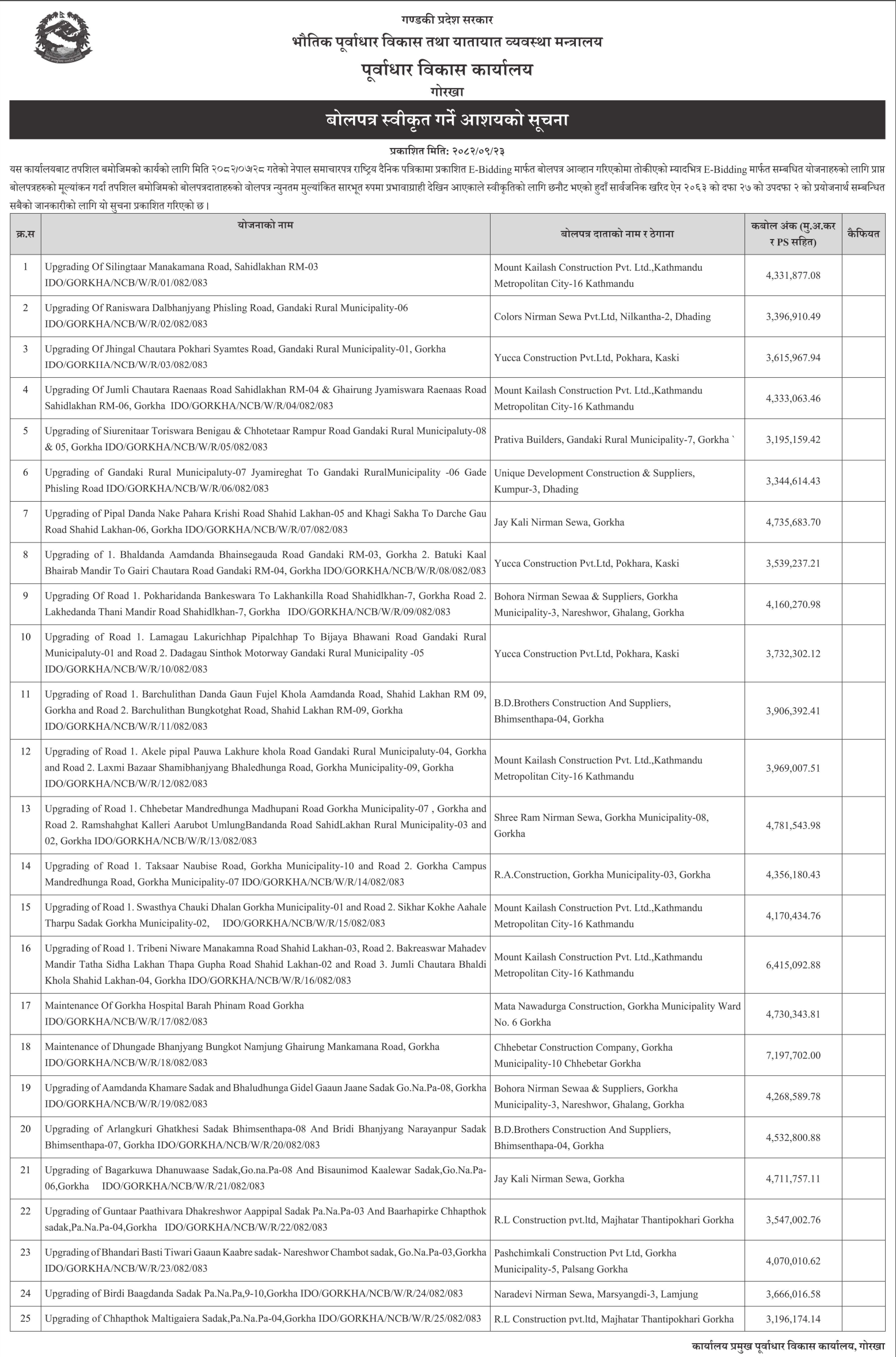 - Award Notice : Road Upgrading Work At Various Places (Swornikita Construction and Suppliers, Gatishil-Gravity JV) |