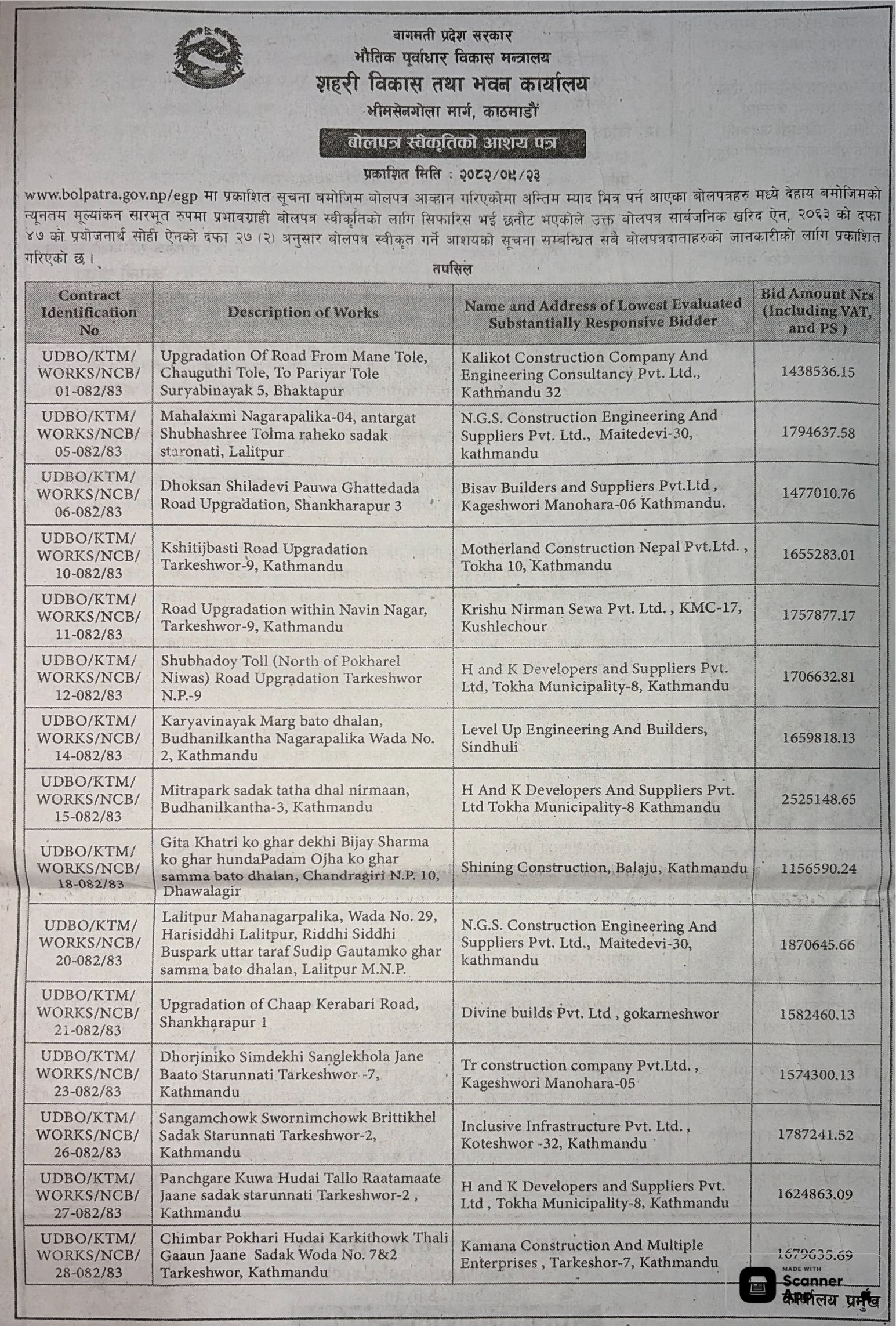 | 36 | Infrastructure Development Office Kavrepalanchok | Upgrading Works on SOS Chowk Rastriya Awash to Gandhi Chowk Road, Dhulikhel Municipaloity - 05 | 06/01/2026 | PPMO | 05/02/2026 | Click Here | |