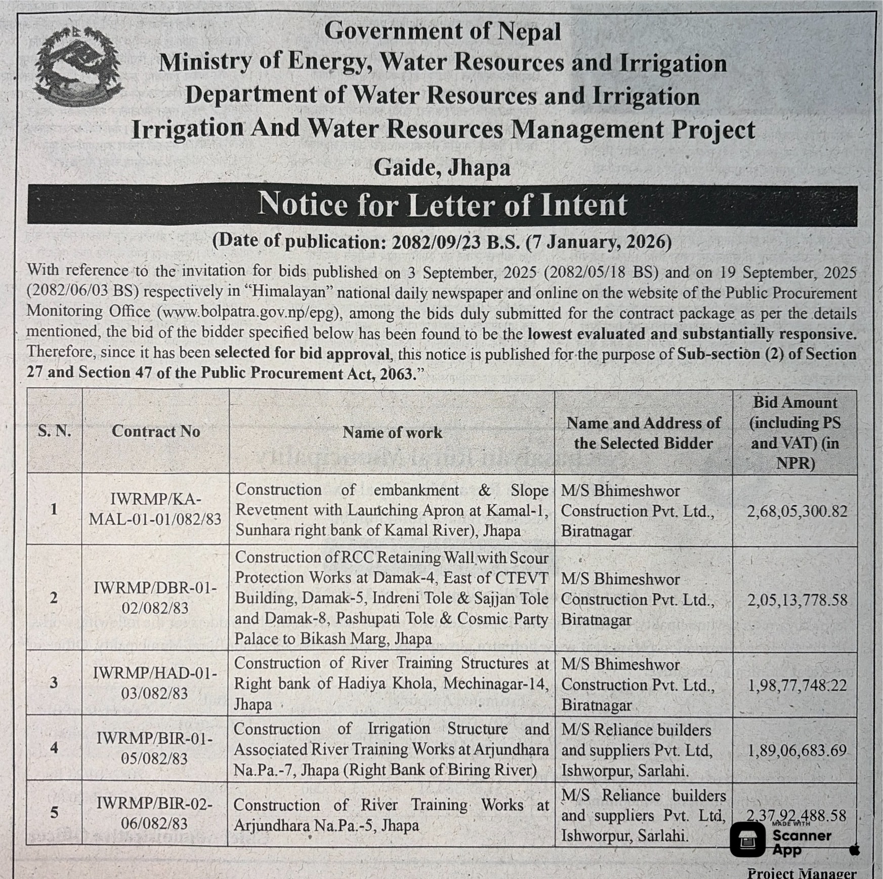 | 11 | Water Supply and Sewerage Management Office, Biratnagar | Construction of Deep Tubewell, borehole platform, Mechenical treatment Plant and Electromechanical Works for Charali Water Supply Project, Mechinagar Municipality-12, Jhapa | 06/01/2026 | PPMO | 05/02/2026 | Click Here | |