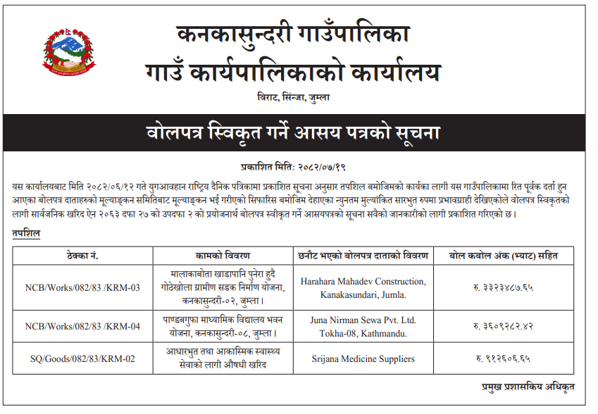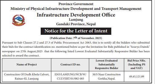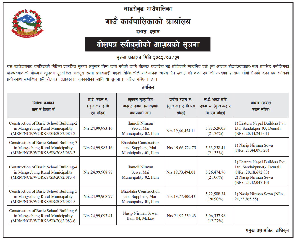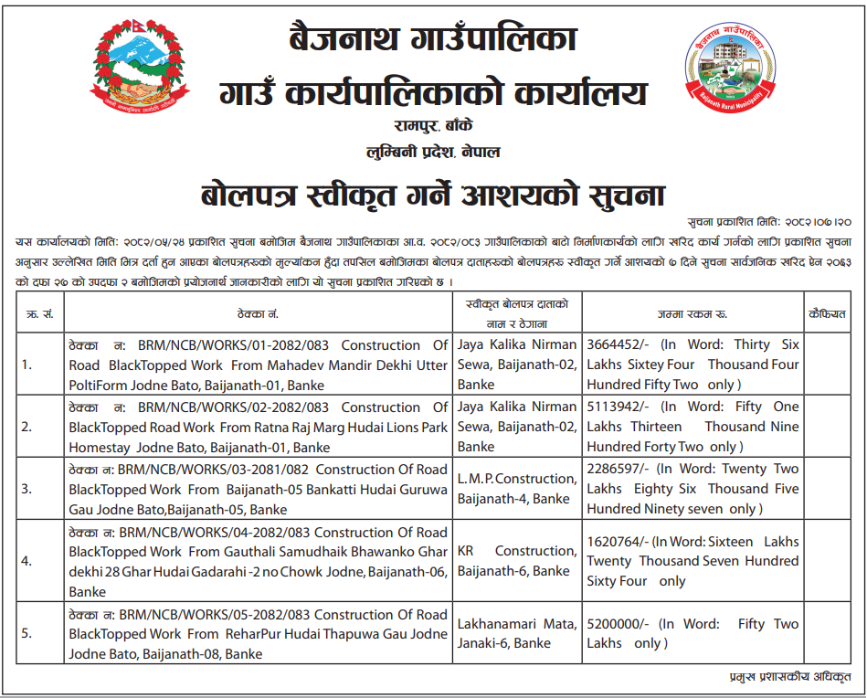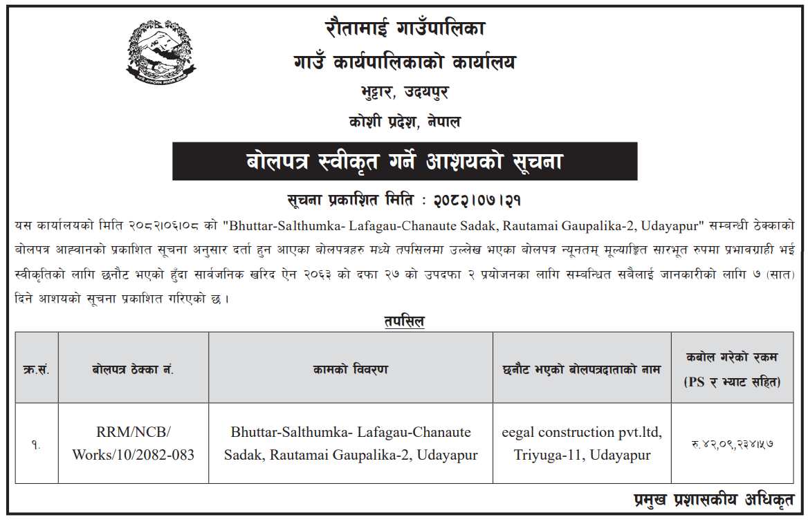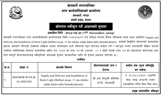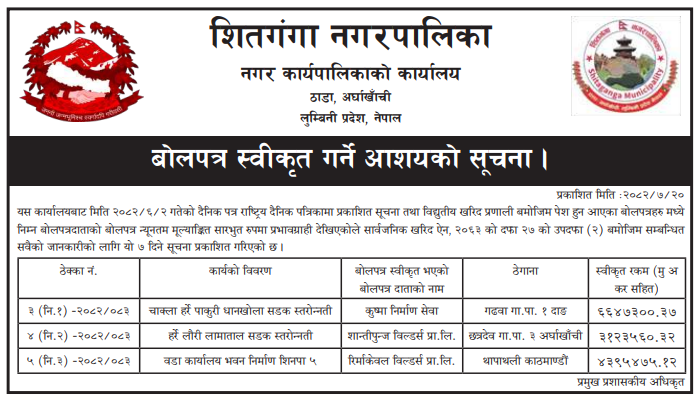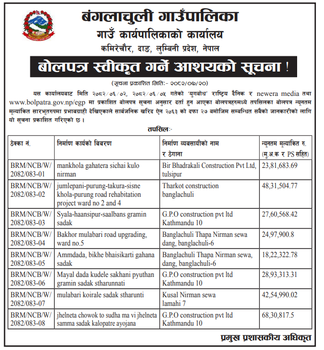 बोलपत्र स्विकृत ; Bid Award (Construction only) 07/11/2025 (Friday)