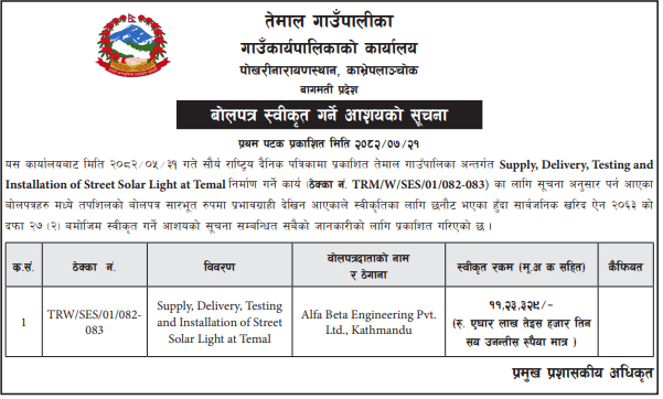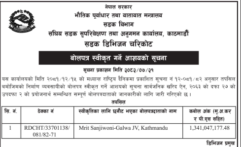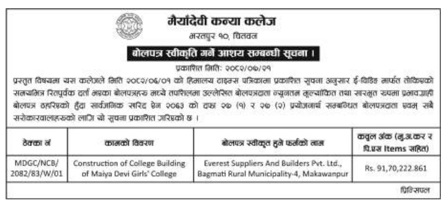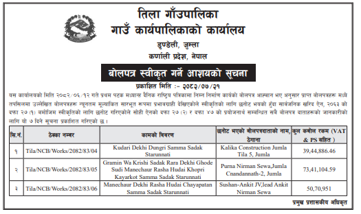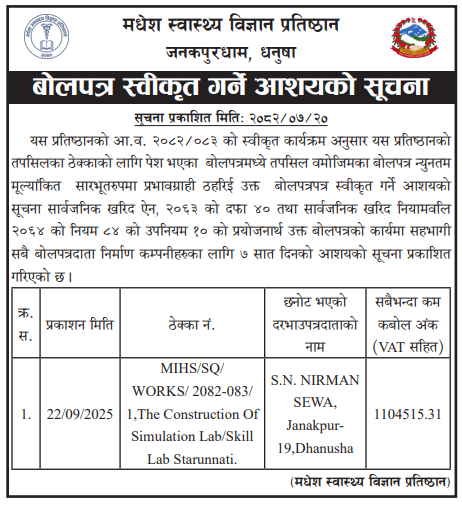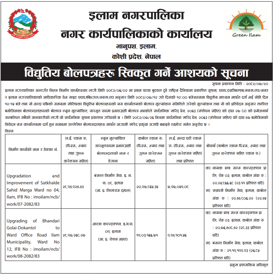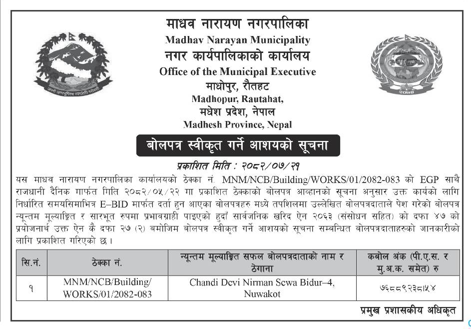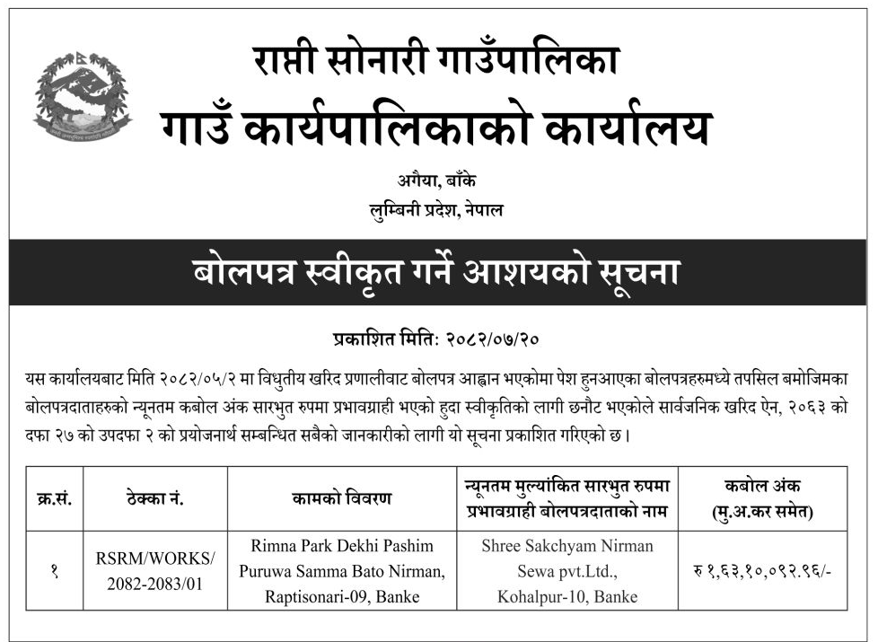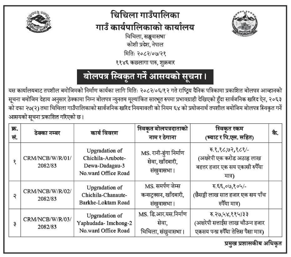बोलपत्र स्विकृत ; Bid Award (Construction only) 07/11/2025 (Friday)