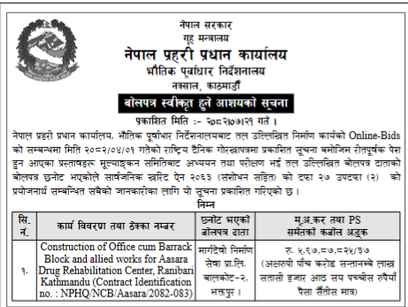 | 60 | Federal Secretariat Construction & Management Office | Construction of Higher Official’s room in Rt. Hon. President office Premises, Maharajgunj. | 06/11/2025 | PPMO | 13/11/2025 | Click Here | |