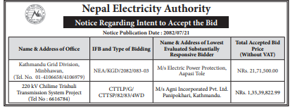 | 85 | NEA, Bhairahawa Distribution Center | Supply and delivery of copper wire | 06/11/2025 | PPMO | 21/11/2025 | Click Here | |