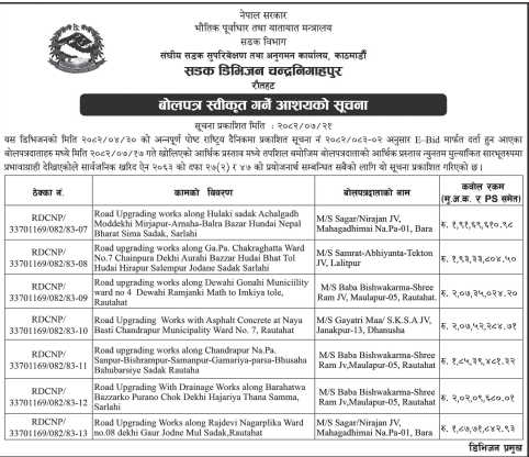 - Award Notice : Road Upgrading Work At Various Places (Swornikita Construction and Suppliers, Gatishil-Gravity JV) |