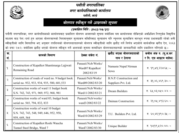 | 34 | Panauti Municipality | Construction of Ward No. 11 Office Building | 06/11/2025 | PPMO | 07/12/2025 | Click Here | |