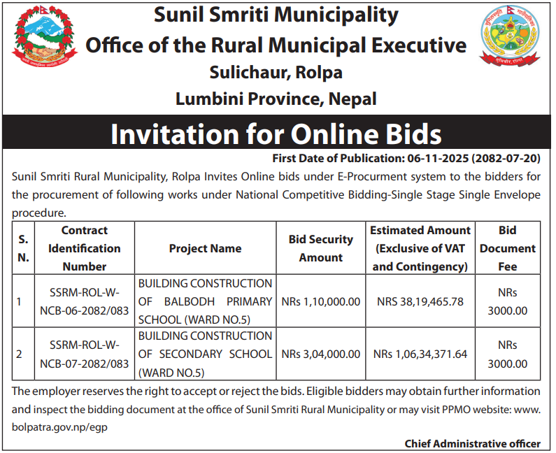 | 39 | Sunil Smriti Rural Municipality, Office of Rural Municipal Executive,Sulichaur, Rolpa | Construction Of Balbodh Primary School Ward No.-5,Rolpa | 06/11/2025 | PPMO | 07/12/2025 | Click Here | |