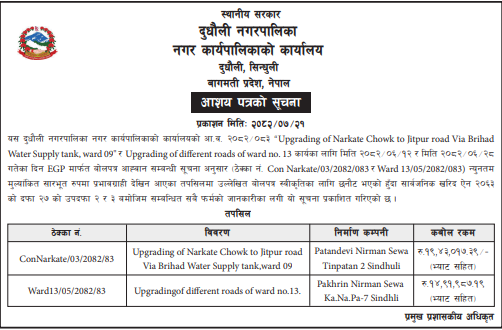 | 23 | Dharmadevi Municipality | Mude - Madamsing Road Way Construction | 06/11/2025 | PPMO | 07/12/2025 | Click Here | |