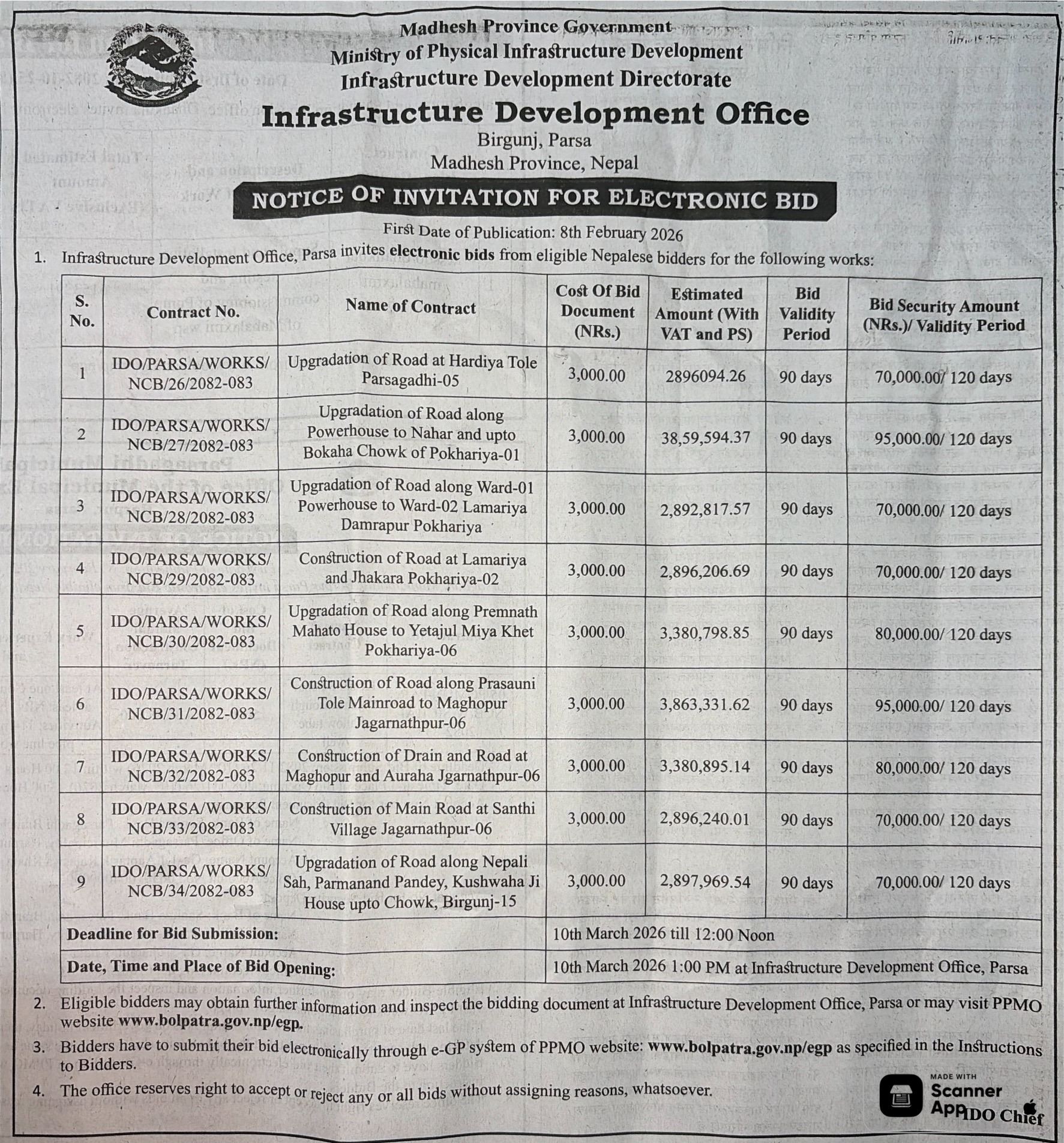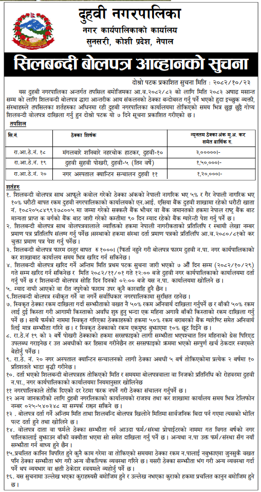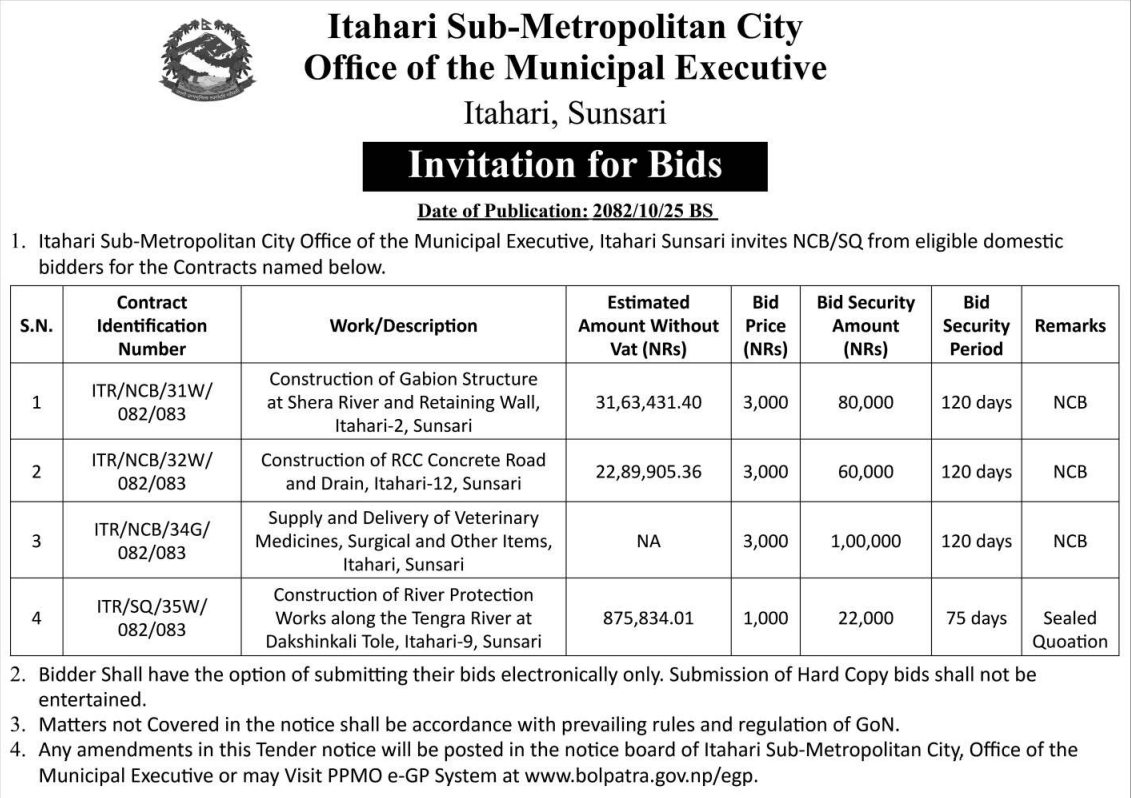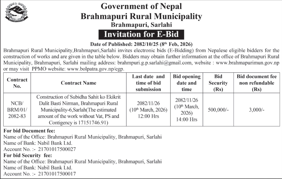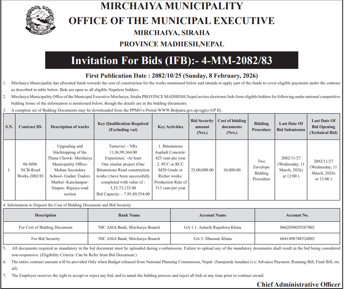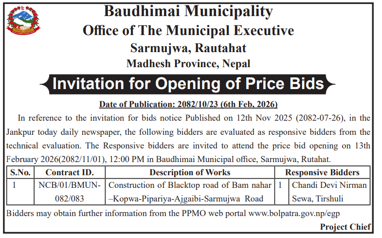 | 11 | Mithila Bihari Municipality Office, Madhesh Province, DHANUSA; | Road and Drainage Upgrading from Teteribati, Anarbati School to Alora, Mithila Bihari Municipality–6, Dhanusha District. | 06/02/2026 | PPMO | 08/03/2026 | Click Here | |
