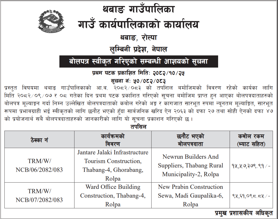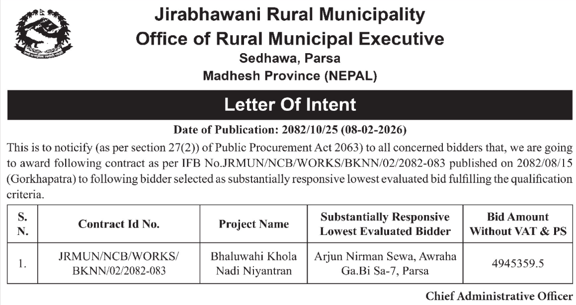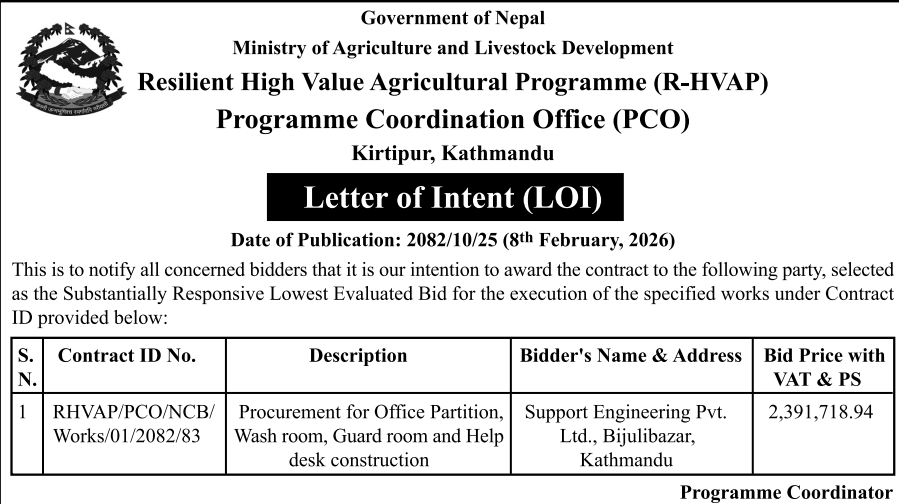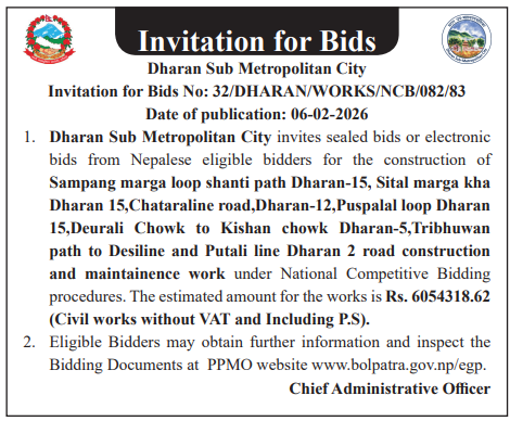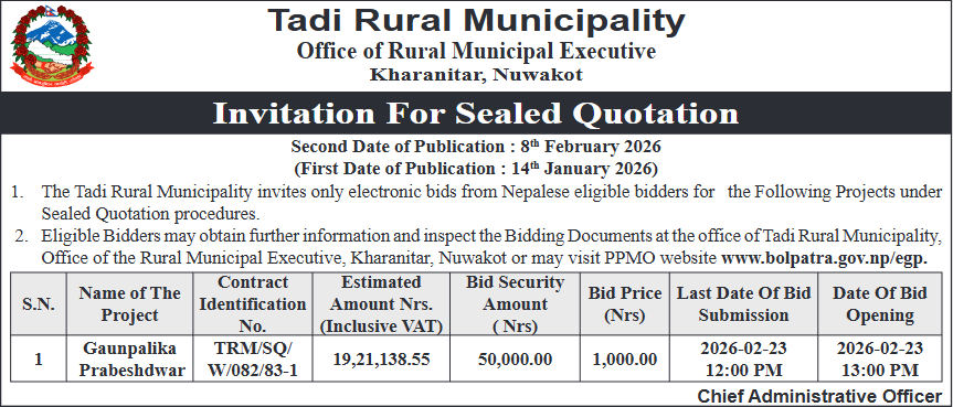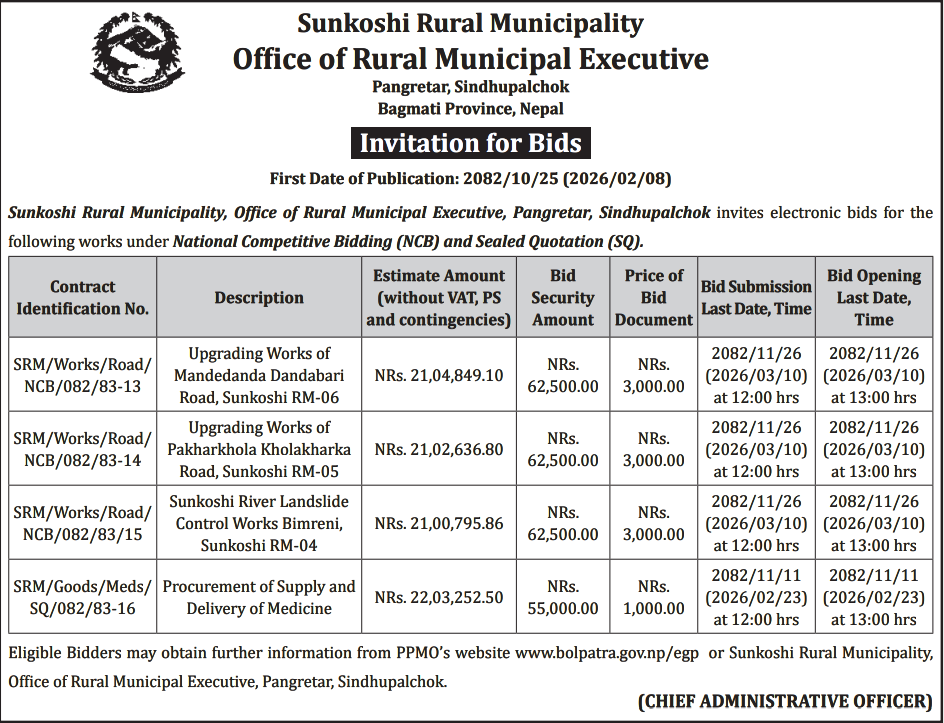 | 195 | Sunwal Municipality Office, Lumbini Province, NAWALPARASI WEST; | Pultol Purvo Nala sahitko Sadak Marmat, Pultol Pashim Margh Sadak ra Bishashya Sagarmatha Adhuro Sadak, Sunwal-06 | 06/02/2026 | PPMO | 09/03/2026 | Click Here | |