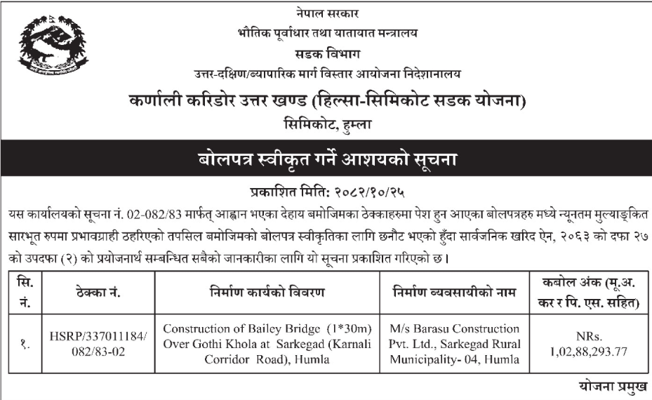 | 198 | Road Infrastructure Development Office, Nawalparasi ( Bardhaghat susta west) | Upgrading of i) Mishrauli mukhya Chauk Dekhi Tharu Gaun Jane Road , Sunwal-11 ii) Sarbottam Cement Karkhana ko gate dekhi Bihari Gaun jnae Road, Sunwal -4 , Nawalparasi, RIDONAW/134/NCB/082-83/31 | 06/02/2026 | PPMO | 09/03/2026 | Click Here | |