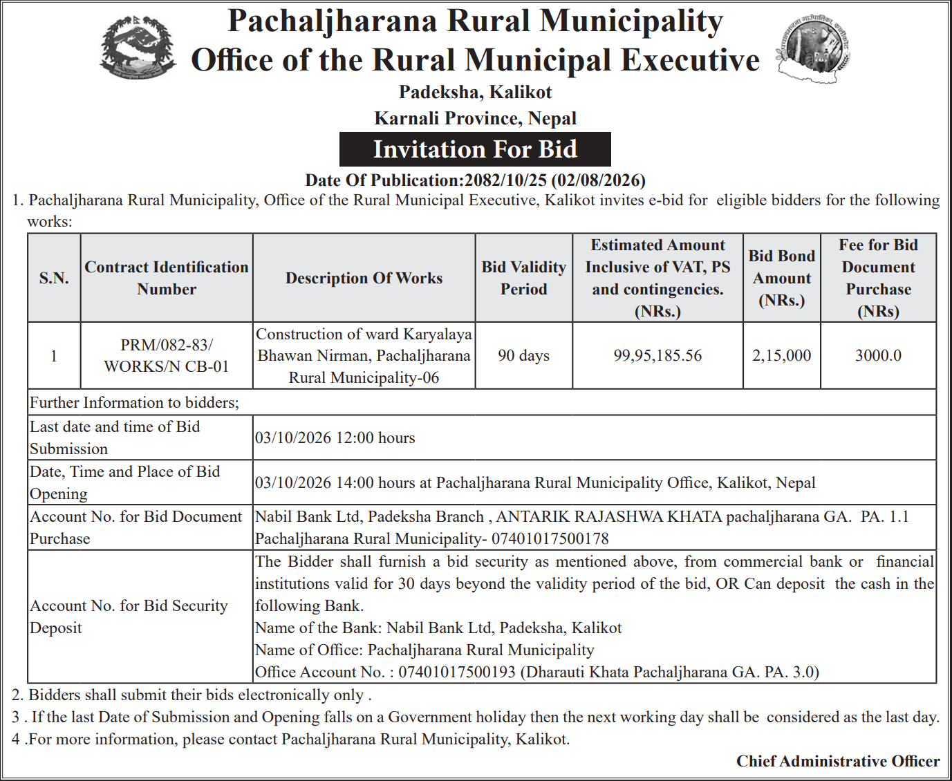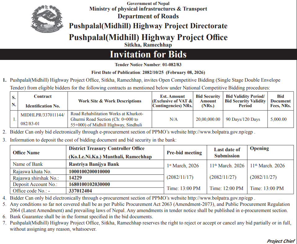 | 156 | Bethanchowk Rural Municipality Office, Bagmati Province, KAVREPALANCHOK; | Patikharka Chalal Ganeshsthan Parthali Geldung Chyamrangbesi Road | 06/02/2026 | PPMO | 10/03/2026 | Click Here | |